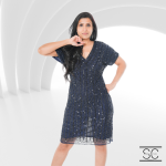 This stunning piece combines a deep navy hue with a cosmic-inspired shimmer that catches the light beautifully, making it perfect for evening events and celebrations. Its sleek silhouette and subtle sparkle create a captivating look that’s both elegant and enchanting. Pair it with understated accessories for a style that’s truly out of this world